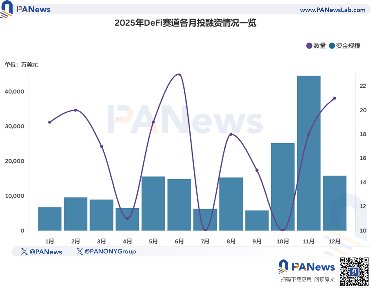 2025年11月,虽然整体一级市场交易笔数来到最低点,但DeFi赛道却“猛然抬头”,不仅项目融资数回升至18起,超过全年平均值16,其流入资金更是创下去年最高记录,获得了超4.45亿美元。