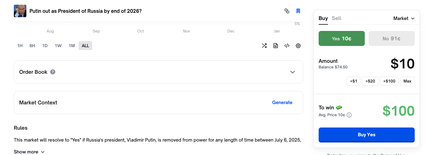 但其实“彩票人”这种心理也是符合理性的。举例说明,如在“普京是否会在 2026 年底前卸任”事件合约中,在常识的驱使下,大部分人会买入“No”,概率也已经显现了人们的态度,但 Yes 侧仍存在 10%的概率,这意味着如果押注 10 美元,那么普京真的在 2026 年底前卸任的话,将获得 100 美元回报,10 倍收益,那赌呗。
