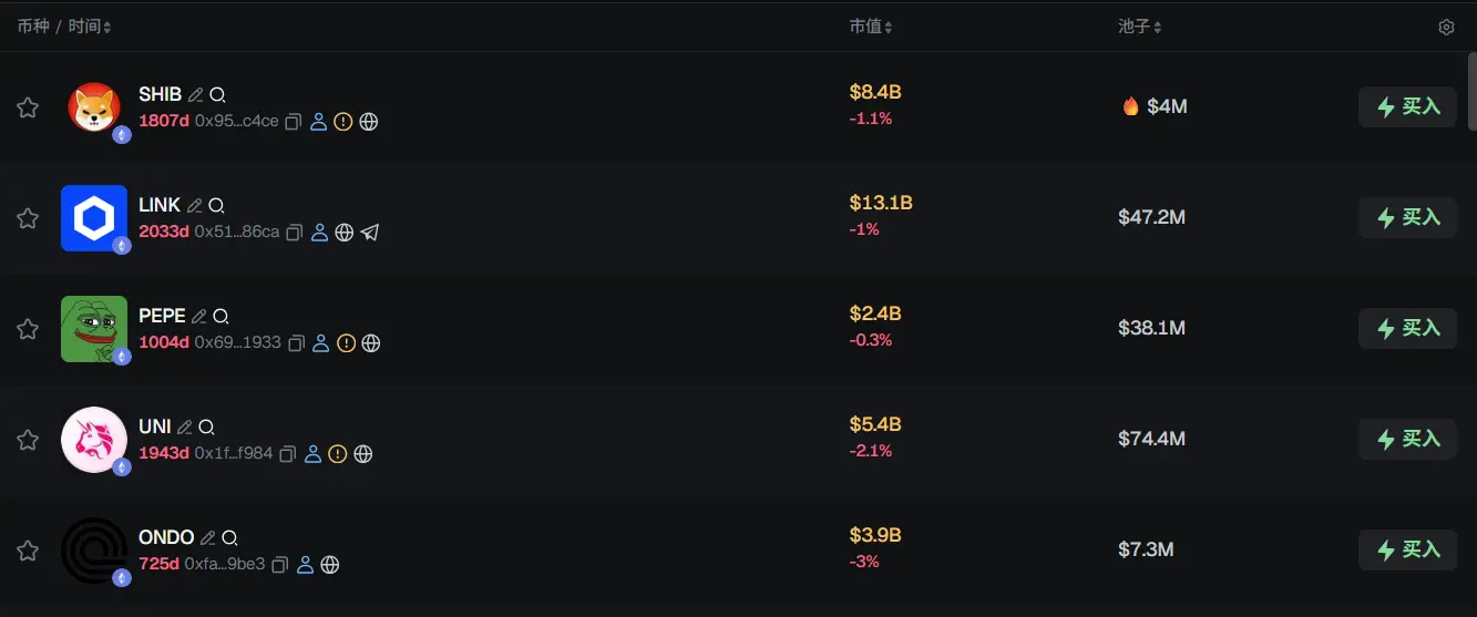 过去 24h ETH 热门代币前五依次为:SHIBLINKPEPE、UNI、ONDO