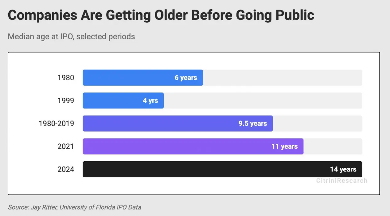 如今,类似苹果在 70 年代、AOL 在 90 年代初那个阶段就上市的公司,几乎没有了。