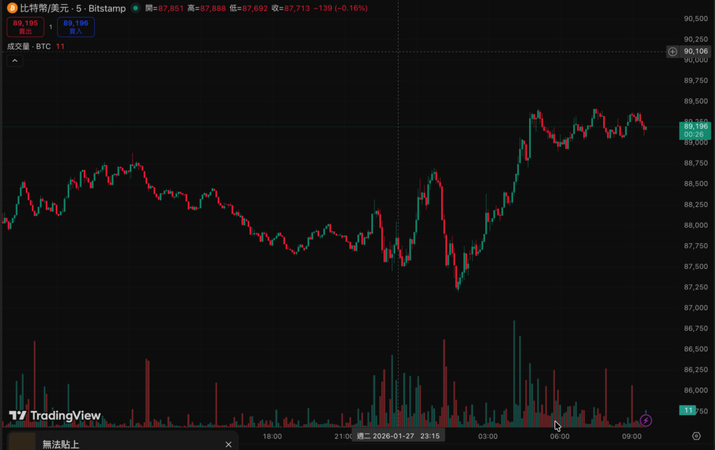 比特幣在清晨跌至87200後V轉漲破89000美元水位,顯示短期幣價支撐強烈,正盤整蓄勢向上,但以太坊波段巨鯨卻在此時出貨一萬枚ETH,獲利百萬美元出場。