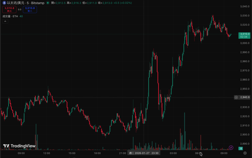貴 金屬持續創下歷史新高,但加密貨幣也迎來補張波段,比特幣在今日(28)清晨下探87200美元水位後立即V轉,衝破 89000 美元水位橫盤,價格暫報89219美元,顯示底部支撐強勁,市場盤面正在往上進行盤整。以太坊方面,幣價也突破3000美元水位,價格暫報3010美元,市場情緒獲得些微緩和。