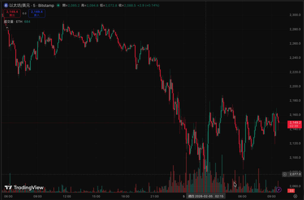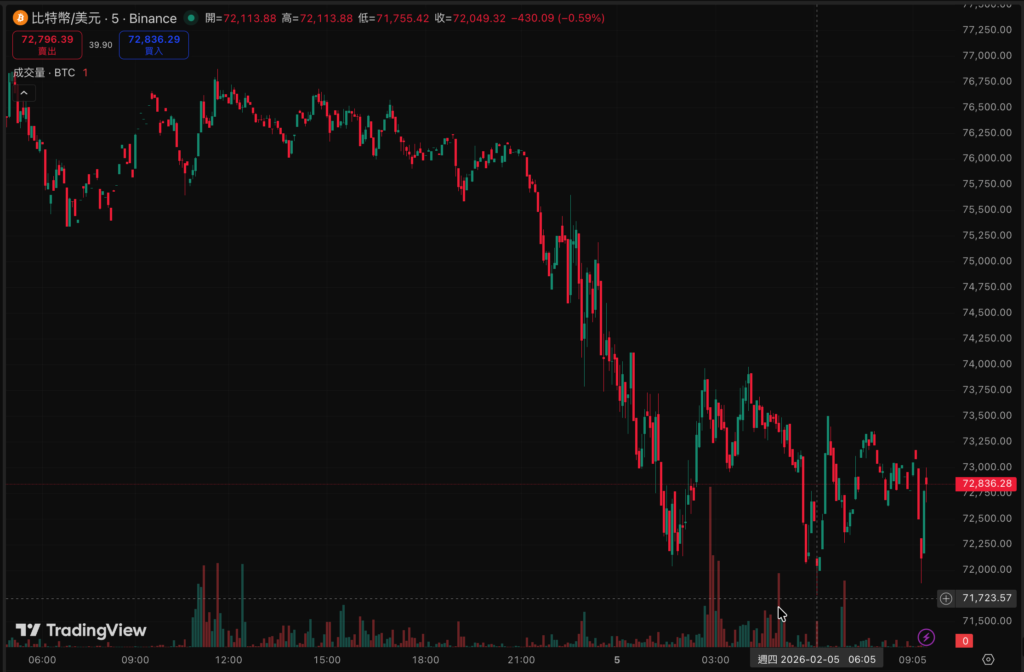 灣時間 5 日凌晨 2 點、6點左右,加密貨幣市場再次出現兩根下跌大插針,比特幣跌破 72,000 美元心理關卡,最低跌至 71723 美元,截稿前已經重新站回 7.28 萬美元之上。以太幣(ETH)走勢與比特幣接近,清晨兩點最低下探 2,075 美元,截稿前現報 2,151 美元。