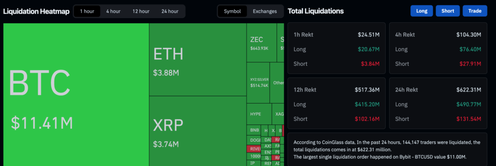 與昨日的大爆倉劇情完全相反,根據 CoinGlass 數據 統計 ,最近 24 小時內,全球共有 14.4 名交易者遭強制平倉,總爆倉金額高達 6.23億美元。其中,空頭部位爆倉金額為4.9億佔比約 72%。加密貨幣行情出現罕見的連四天暴漲暴跌多空輪流尬爆的狀態。