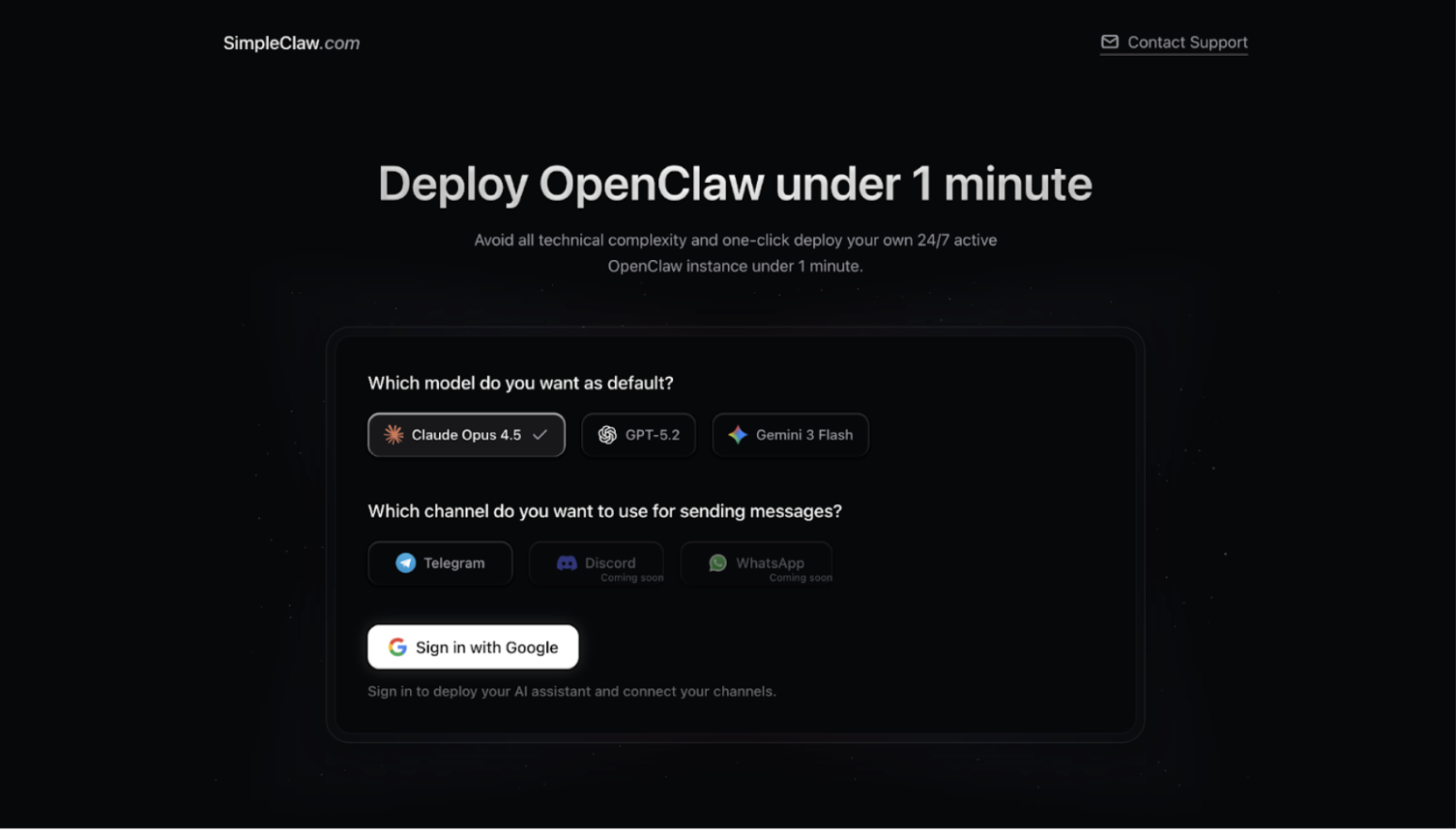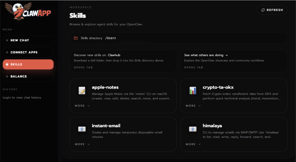 - 可视化交互:官方提供了极为清晰的引导界面,支持一键连接 Telegram 和 Moltbook 等通讯平台,一键安装 skills