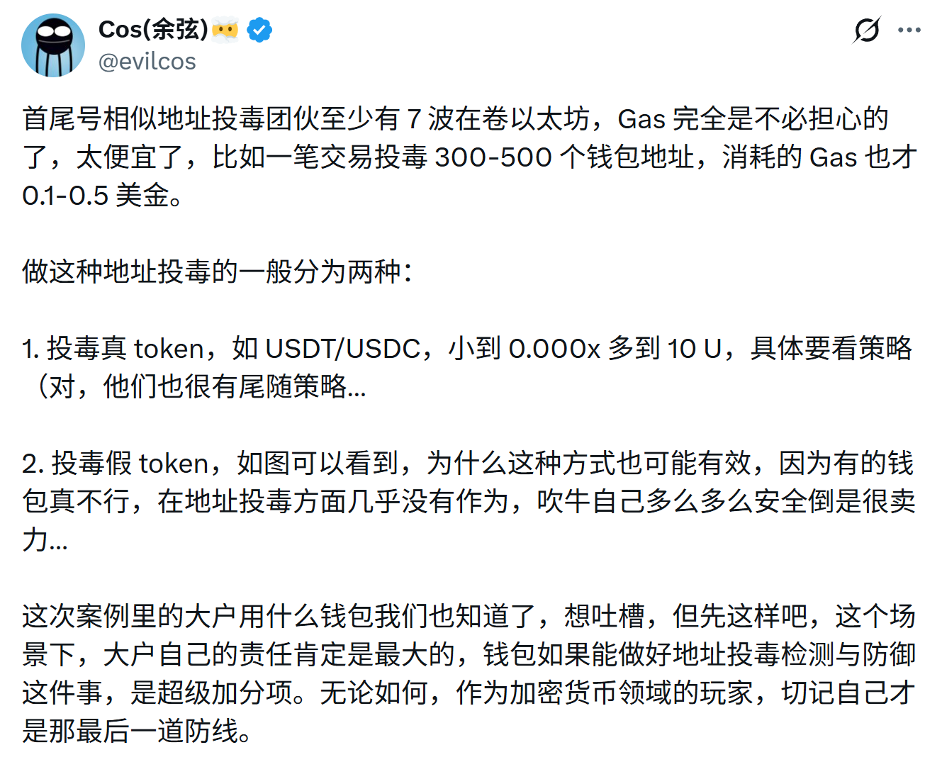 由于 Gas 成本极低,攻击者可以批量投毒数百甚至上千个地址,等待少数用户在复制粘贴中犯错。成功一次,收益远高于成本。