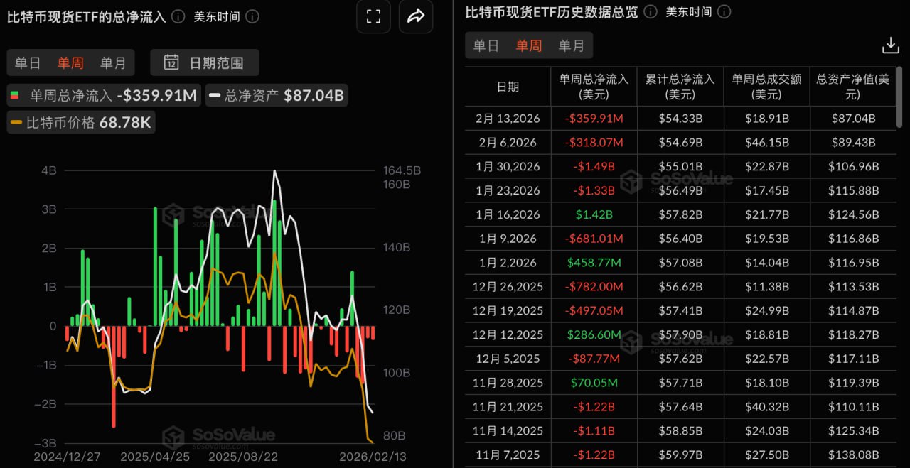 PANews 2月15日消息,根据 SoSoValue 数据,本周交易日(美东时间 2 月 9 日至 2 月 13 日)比特币现货 ETF 净流出 3.60 亿美元。
