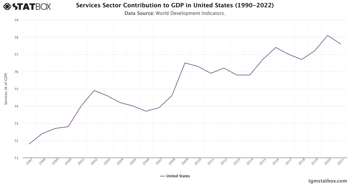 事实上,如下所示,美国服务业对美国 GDP 的贡献接近 80%。