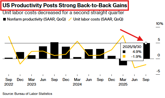 如下所示,AI 正加速提高生产力。2025 年第三季度,美国劳工生产率增速达到两年来的最高水平:
