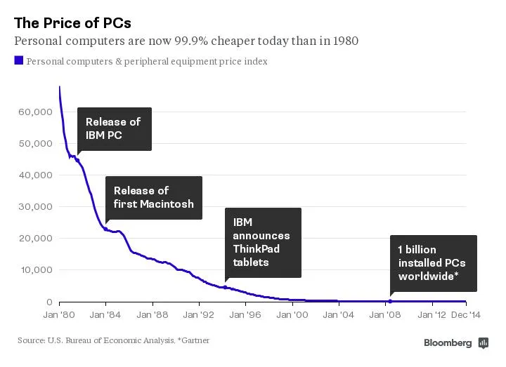 如下所示,如今个人电脑的价格比 1980 年便宜了 99.9%。