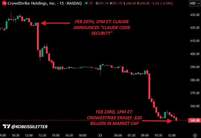在上述例子中,CrowdStrike 的股价暴跌几乎就在 Claude 发布“Claude Code Security”的那一刻发生。