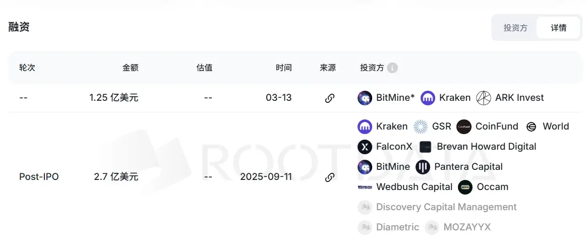 BitMine、World Foundation、FalconX、Pantera、GSR、Coinfund、Brevan Howard、Wedbush 等知名 VC 均参与投资。