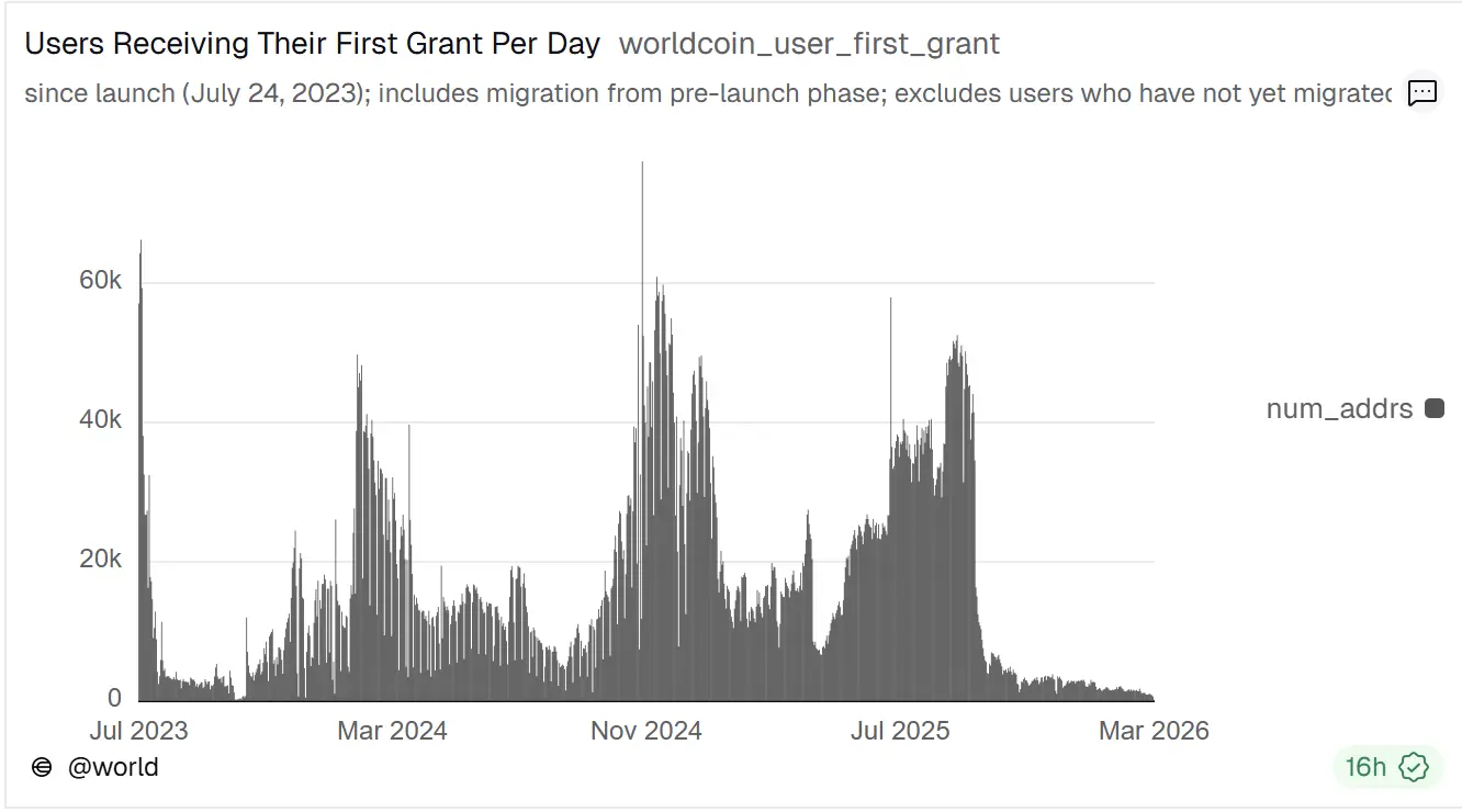 所有这些动作的意图都很明确: World 在试图为其基于虹膜的身份验证 ID 拓展更多应用场景。在利用“监管套利”快速扩张四年后,新用户增长几乎停滞,World Chain 用户量寥寥,原本用于吸引用户注册验证的高额 WLD 奖励,如今成为持续不断的巨额抛压。
