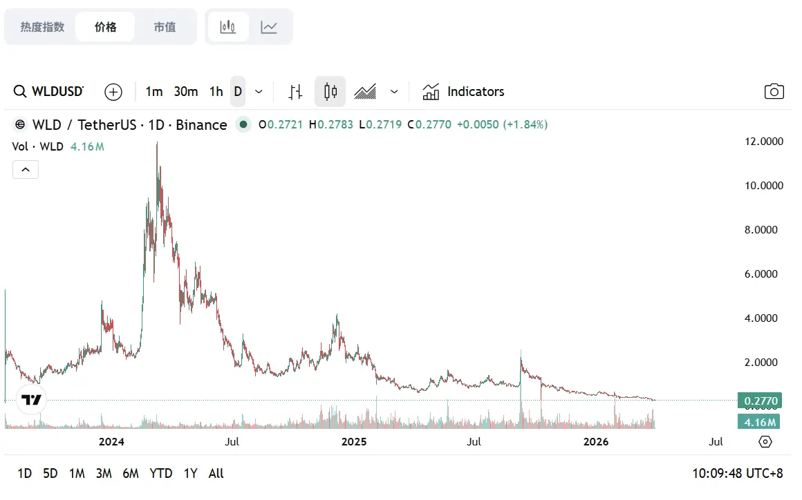 然而,这一系列的资本操作均为从根本上扭转 WLD 价格的颓势。至 3 月底,WLD 价格一度跌至 0.24 美元,创造历史新低。