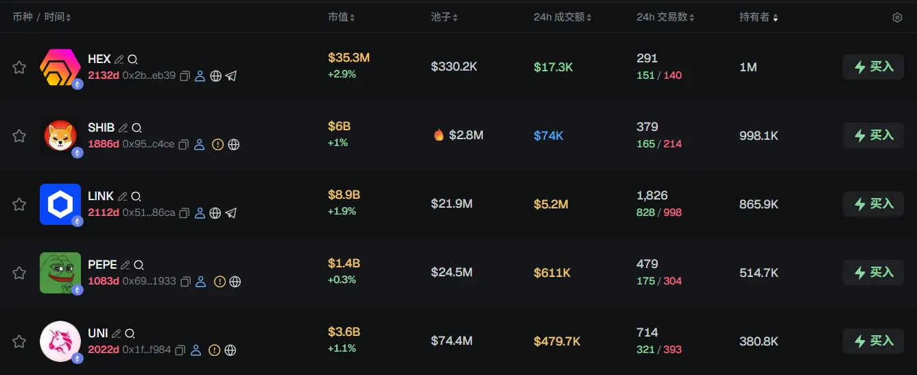 过去 24h ETH 热门代币前五依次为:HEX、SHIB、LINK、PEPE、UNI