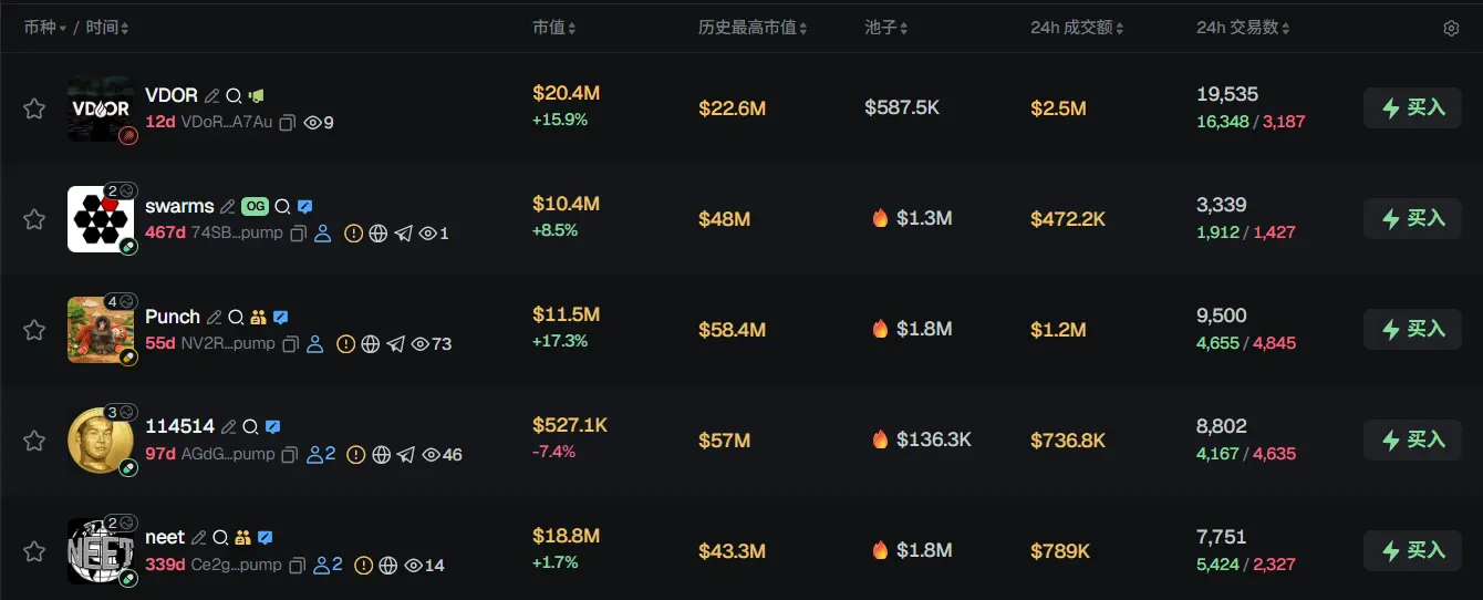 过去 24h Solana 热门代币前五依次为:VDOR、swarms、Punch、114514、neet