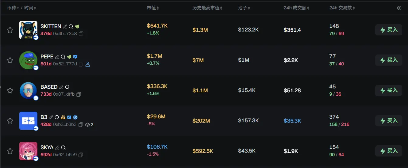 过去 24h Base 热门代币前五依次为:SKITTEN、PEPE、BASED、B3、SKYA