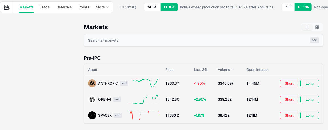 Hyperliquid 本身不发行任何 Pre-IPO 产品,真正在上面部署合约的是第三方项目 Ventuals。 Ventuals 基于 Hyperliquid 的 HIP-3 标准搭建,目前主网已上线 3 个合约(pSPACEX、pOPENAI、pANTHRO)。