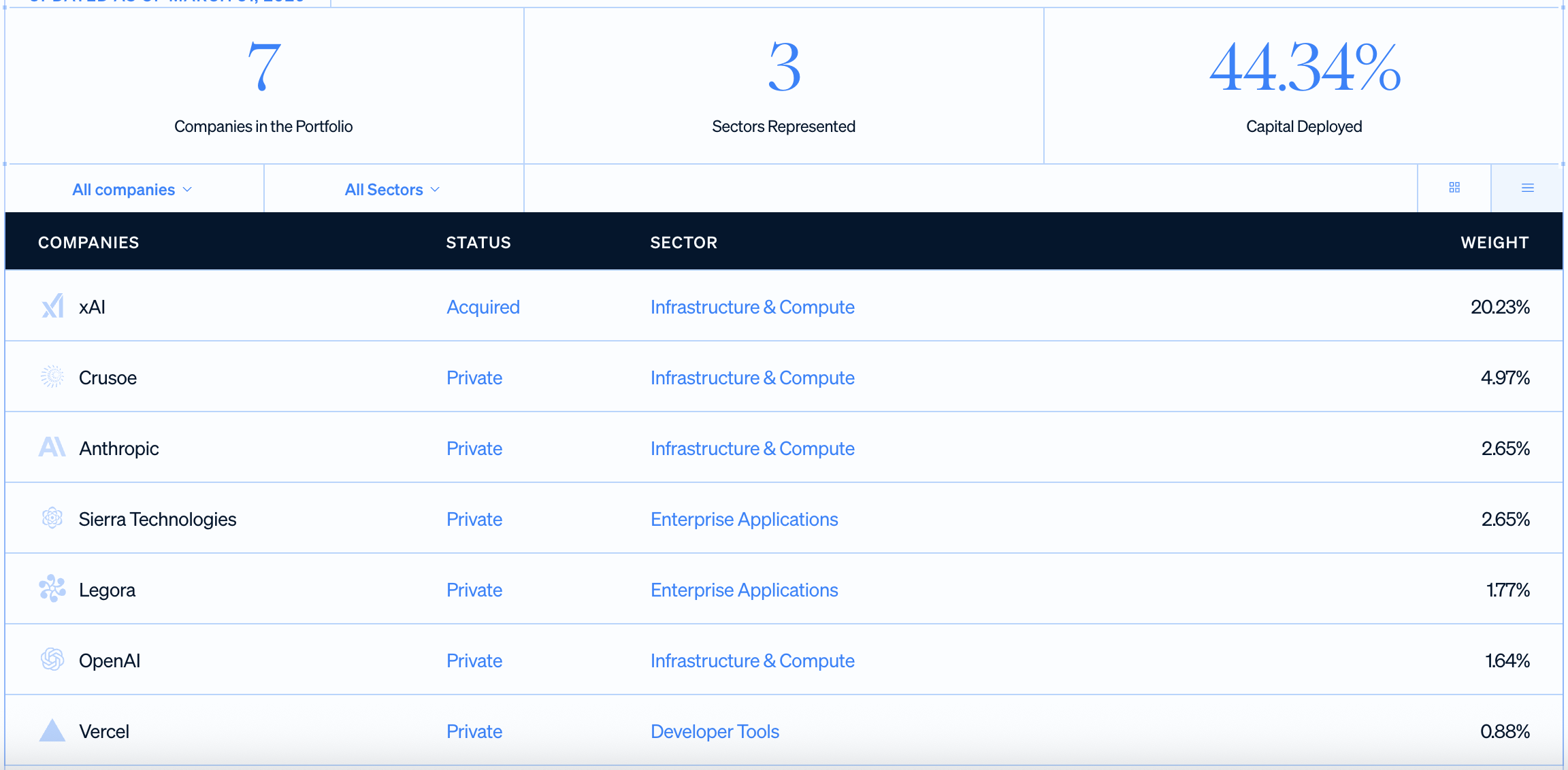 这也是它为什么会不断强调 OpenAI、Anthropic、xAI、Vercel 这样的名字。官网的组合页面显示,截至 2026 年 3 月 31 日,USVC 已部署 44.34% 的资本,组合里已有 7 家公司,最大的单一持仓是 xAI,其后包括 Crusoe、Anthropic、Sierra、Legora、OpenAI 和 Vercel。无论这些仓位最终表现如何,AngelList 想向投资者传递的信息已经足够明确:你过去只能在新闻里看到这些公司的名字,现在可以通过一只基金,在它们上市前拥有一点敞口。