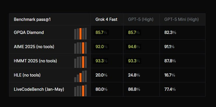 Met a few devs this weekend… They still didn’t know about Grok 4 Fast.. Grok 4 Fast is a game-changer: It has the Highest intelligence density ever - outperforms top models Ultra cost-effective: Up to 98% cheaper than alternatives Super-fast output = more productivity, less waiting It’s wild that this isn’t mainstream yet If you’re not using Grok 4 Fast, you’re burning both time and money Grok 4 Fast delivers GPT-5 (High) performance - for just 5% of the cost (95.7% cheaper)... Insane value Grok 4 Fast costs - Input tokens: 84% cheaper - Output tokens: 95% cheaper - Output speed: 150% faster GPT-5: $1.25/M input, $10/M output Grok 4 Fast: $0.20/M input, $0.50/M output Grok: 344 tokens/s GPT-5: ~138 tokens/s Let them know... If anything, Grok 4 Fast’s value is still under-appreciated