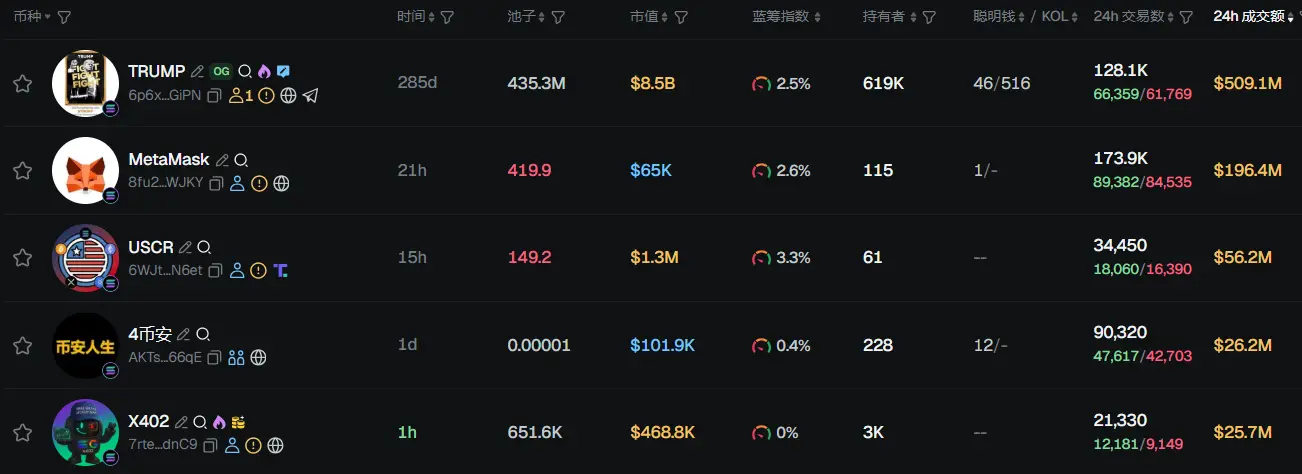 过去 24h Solana 热门代币前五依次为: TRUMP、MetaMask、USCR、4币安、X402