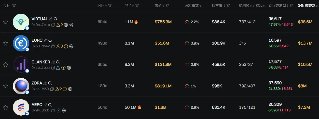 过去 24h Base 热门代币前五依次为: VIRTUAL、EURC、CLANKER、ZORA、AORA