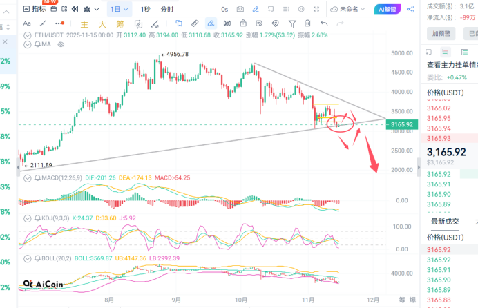 ETH截止发稿前高点3194附近,低点3110附近,以太比大饼干脆些直接跌破近期支撑,随后开始区间震荡,周末基本维持震荡了,从大周期上看以太进入收敛口中,后续就看怎么突破了,目前这种结构性行情能把握住也是不错的。