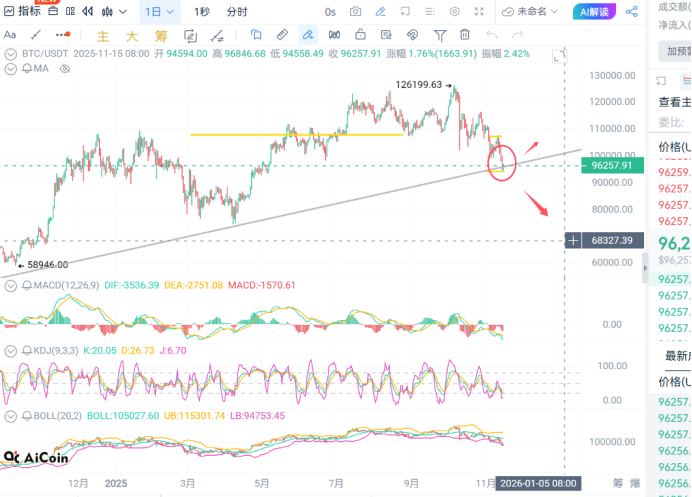日线级别昨日收了阴线,但是量并未放出来,布林带开口继续保持向下,受布林下轨94000支撑。4小时级别出现背离,布林带开口向下,受布林中轨100000压制。
