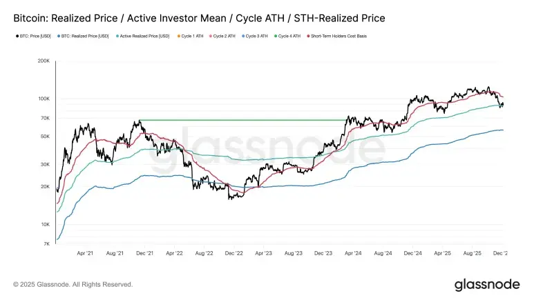 同时,观察短期持有者成本线与活跃实现价格线的关系。如果短期线向下穿过活跃线,风险会迅速增加。目前,这种不利的交叉现象尚未发生。