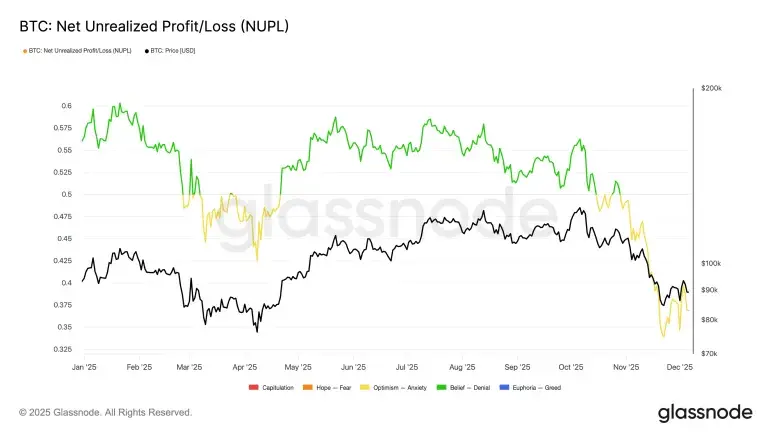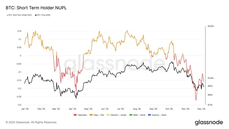 NUPL为0.36,刚刚进入平衡区间。短期持有者NUPL为-0.155,新买家处于亏损状态。一旦价格触及成本线,他们就会抛售。这证实了市场情绪偏弱。