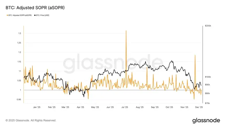 aSOPR(调整后花费产出利润率)持平于1.0。卖家以成本价交易,即便利润微薄也选择抛售。