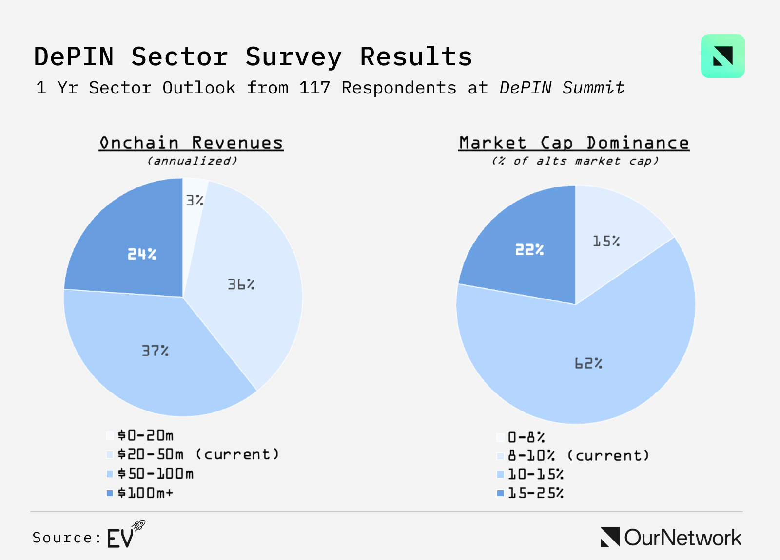 在八月份于纽约举行的年度 DePIN 峰会上,风险投资机构 E V3 对 117 位 DePIN 创始人和投资者进行了调查,询问他们对未来十二个月的预期——大多数人预计 DePIN 领域的链上收入将达到从 2000 万美元增长到 5000 万至 1 亿美元的年经常性收入(ARR)或更多,同时市场资本占比将在所有山寨币中从 8-10% 提高到 10-15% 。