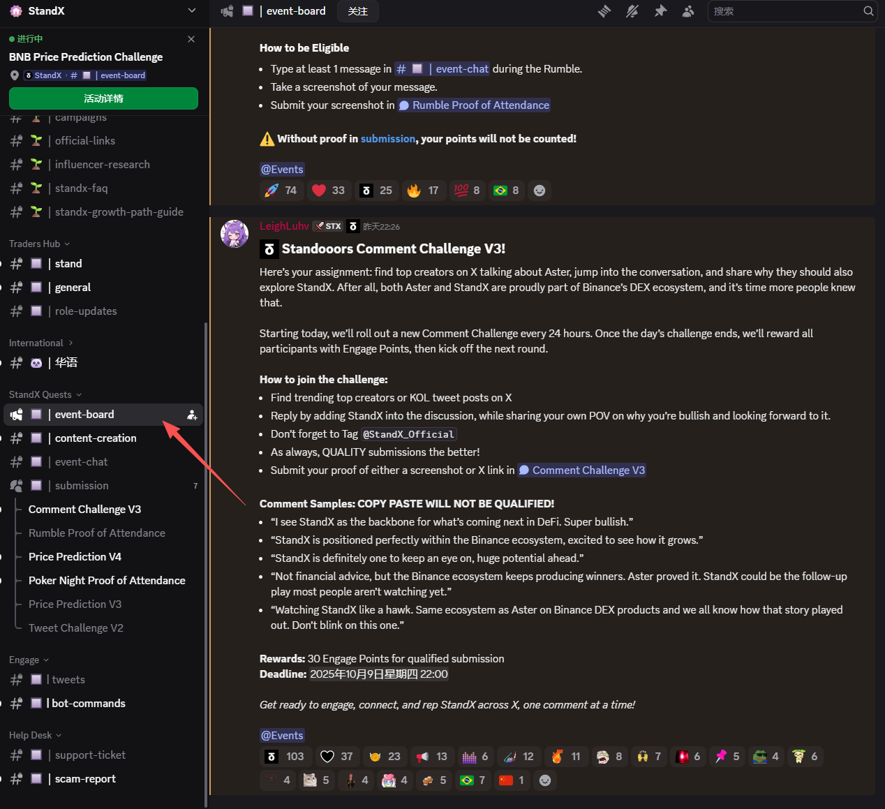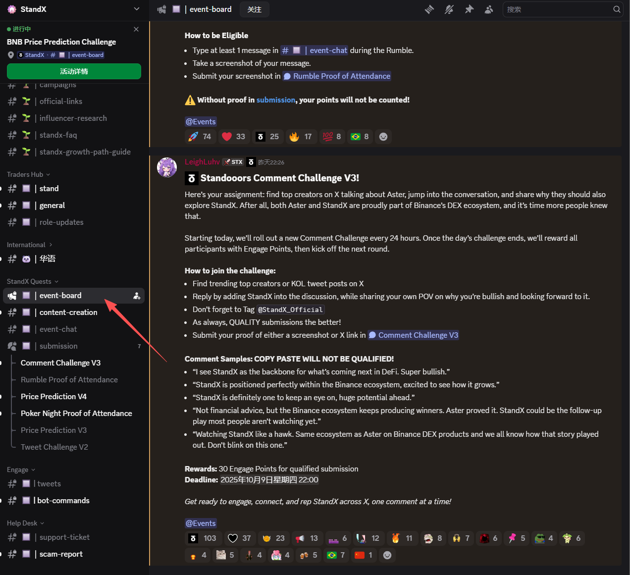STEP 2. 如下图所示,找到“event-board”子频道,每日会发布新任务,完成任务可获得 20 或 30 积分(看具体任务),任务种类包括参与德州扑克挑战、主流币种价格分析与预测、在 X 平台分享 StandX 相关内容、参与大逃杀游戏等。