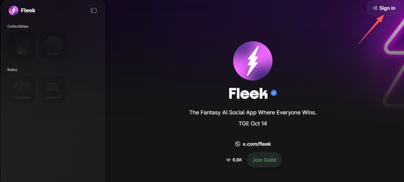 STEP 1. 进入 Fleek 在 Guild 上的任务网站(链接: https://era.guild.xyz/fleek_xyz ),并点击“SIgn in”进行账号登录。