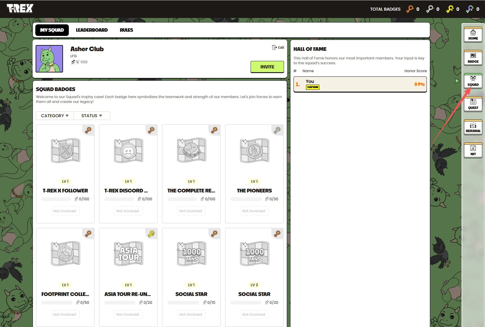 STEP 3. 点击右侧的“SQUAD”,选择一个战队加入,也可以加入我的战队,邀请链接: s.trex.xyz/ll1g9K 。