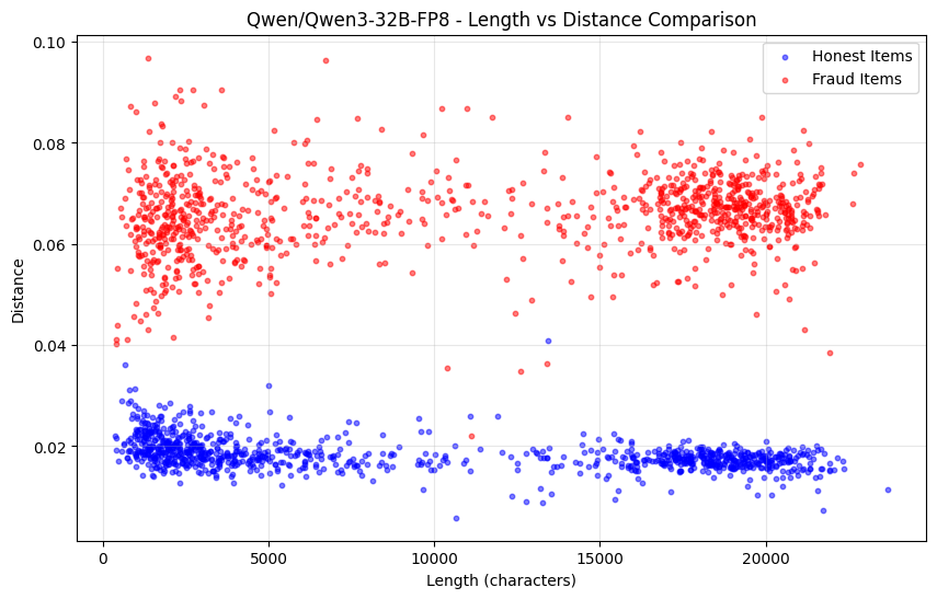 下图为Qwen3-32B FP8 (诚实) vs INT4量化 (欺诈))的概率分布距离随序列长度的变化: