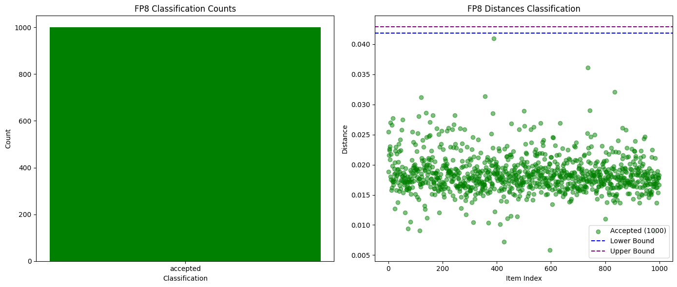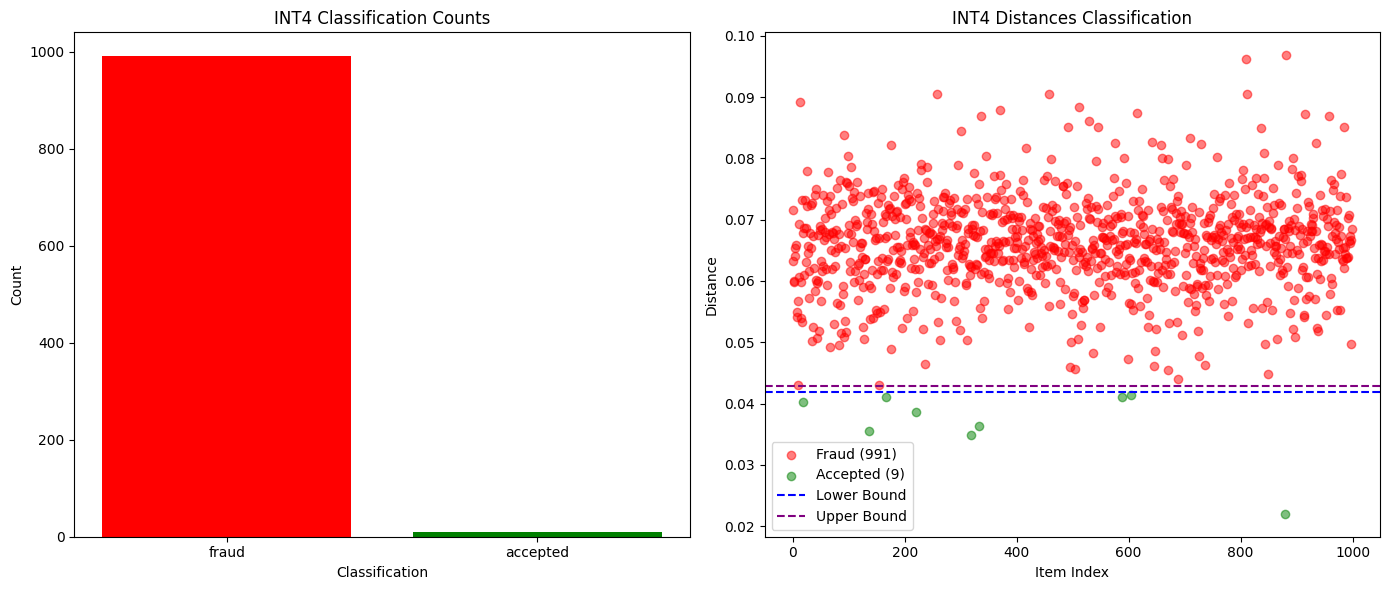 对于捕捉完全不同的模型,甚至是同一模型的不同量化版本,比较前K概率被证明是足够的。如下方的图表所示,当我们在Qwen3-32B FP8与INT4量化版本之间进行测试时,我们实现了99%的欺诈检测率,且零误报。其他模型的概率分布差异也足够大,使得作弊行为能够在一个纪元内被轻松发现,而诚实的参与者则保持安全。