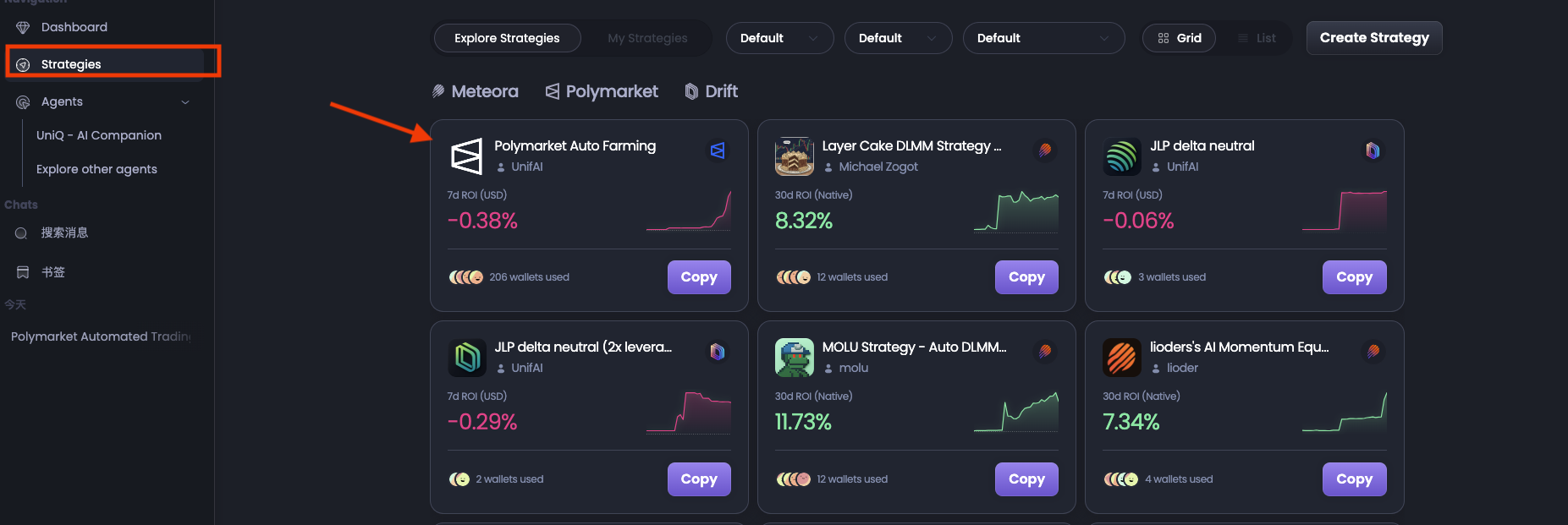 运行这个策略的操作很简单,首先使用 Telegram 账户登录 UnifAI 官网,点击“Strategies”后再点击进入“Polymarket Auto Farming”策略代理。