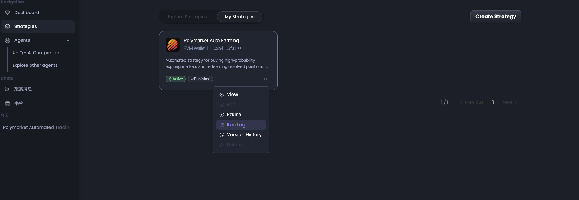 在“Strategies”页面再点击“My Stratrgies”便可以看到目前正在运行的代理。同时,用户也可在此次选择停止该策略,或者点击“Run Log”查看策略执行日志。