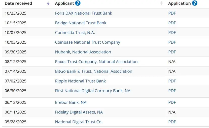 二是美国银行牌照申请 Ripple 2025 7 2 日 向美国货币监理署( OCC )提交设立 Ripple National Trust Bank 的申请,目前处于 120 天法定审查期,最晚将于 2026 11 2 日 前出初步结果。根据 OCC 官网最新状态, Circle First National Digital Currency Bank )于 6 30 日申请,已超 120 天审查期,仍未获批 ; Paxos 8 12 日申请,审查中 ; Coinbase 10 3 日申请,审查中。