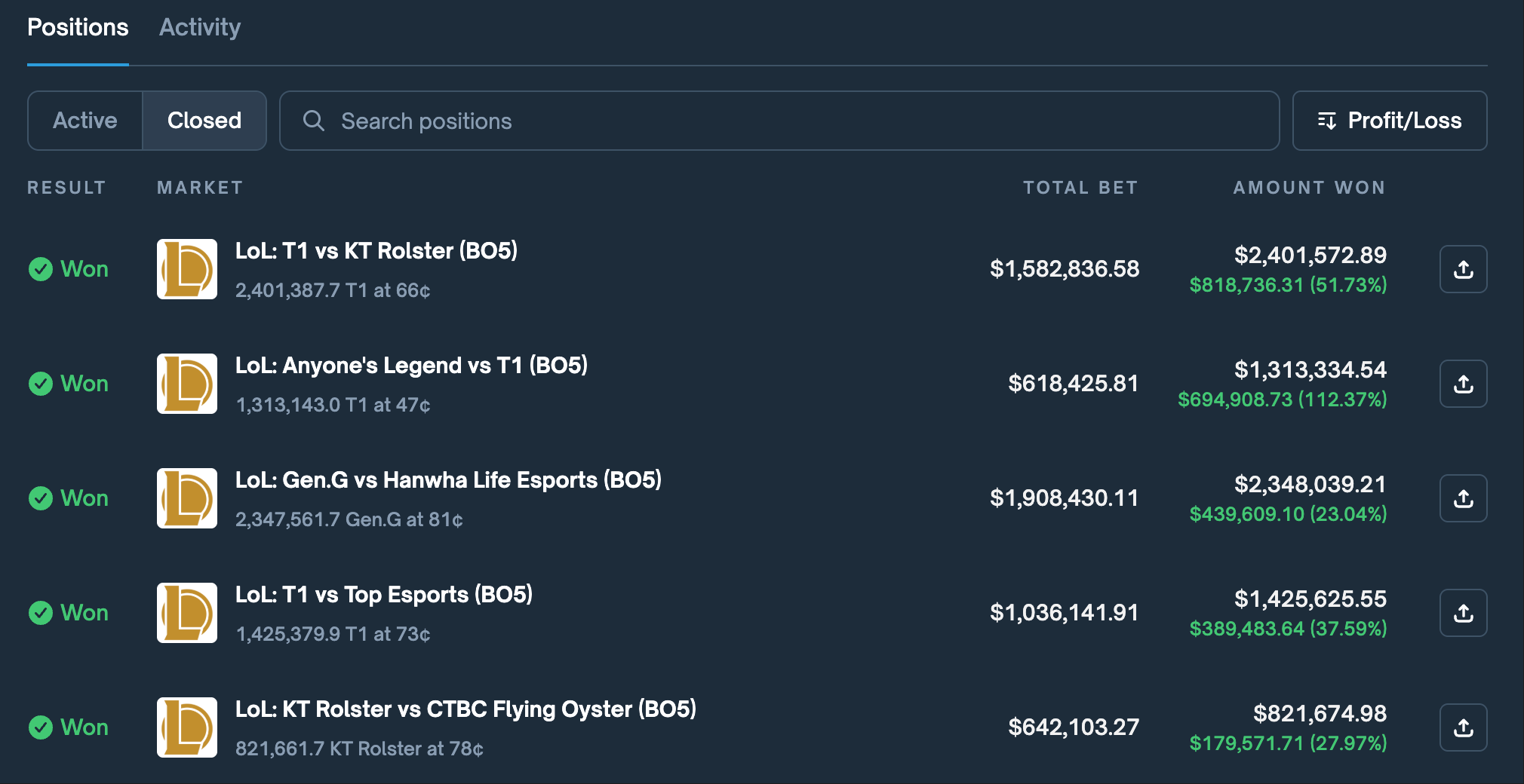 Polymarket 押注部分战绩一览