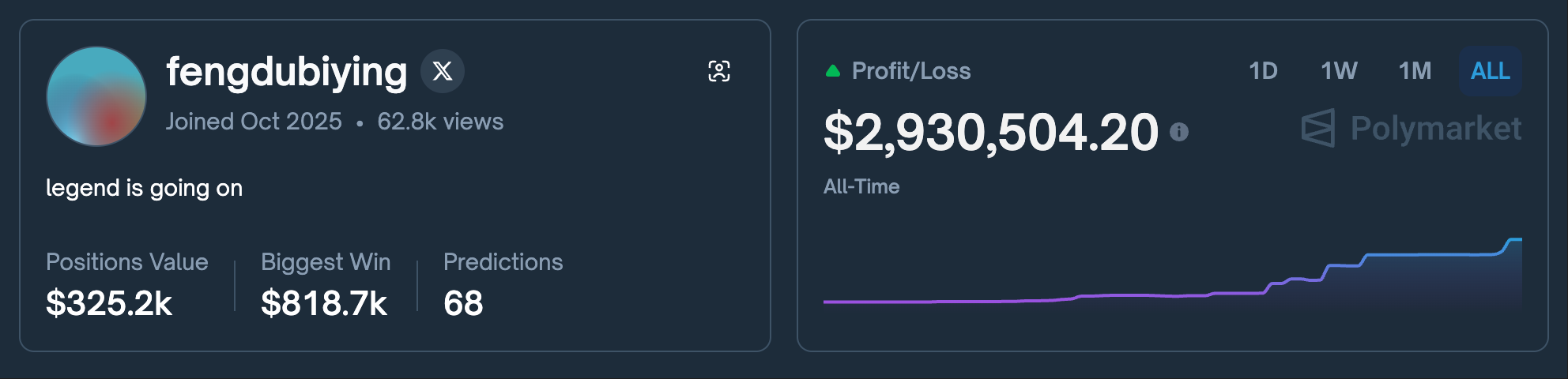 随着代币空投与重返美国市场的消息得到 Polymarket 官方的确认,预测市场成为当下市场为数不多数据仍在猛增的加密赛道。而在这样一个新兴市场上,有一个 ID 名为 fengdubiying(逢赌必赢)的交易员实现了 在 25 天内资产翻了超过 225 倍的傲人战绩 ,从 1.3 万美元的资金开始,一路滚仓到 293 万美元的利润。他是如何在冷淡行情拿到了这样的成绩?又是如何选择押注事件标的?有哪些个人的独特策略?