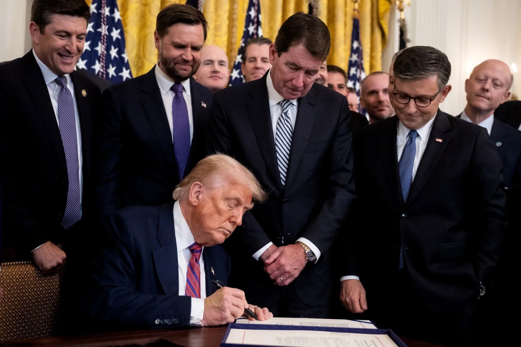 2025 年 7 月 18 日,美国总统特朗普在白宫举行《GENIUS 法案》签署仪式,Circle CEO Jeremy Allaire(右上角)出席了该仪式。摄影师:Francis Chung /《政客》杂志 / 彭博社