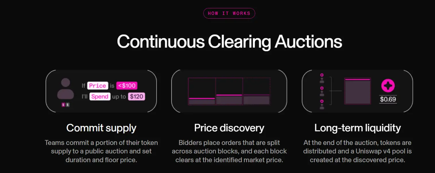 团队将部分代币供应承诺到公开拍卖中,并设置持续时间和底价。价格发现竞标者下单,这些订单在拍卖区块中拆分,每笔拆分订单均按确定的市场价格清算。