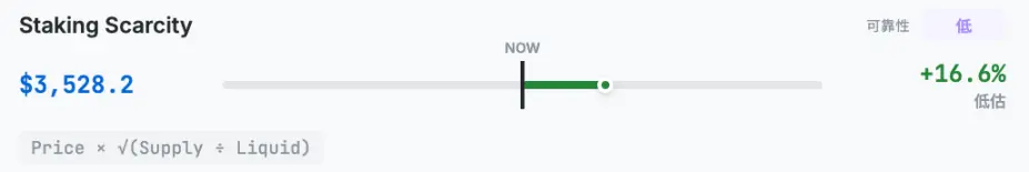 该模型考虑到因为质押而无法在市场上流通的以太坊会提高以太坊的「稀缺性」,用当前以太坊的价格乘上总供应量和流通量比值的开方,即 Price × √(Supply ÷ Liquid),得出的价格是 3528.2,较目前价格有 16.6% 的上涨空间。