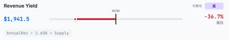 所有估值模型里唯一一个高可靠性的估值模型,Hashed 称该模型受到将加密货币评估为另类资产类别的 TradFi 分析师青睐,就是将以太坊作为收益型债券进行估值。计算方法为以太坊的年收入除以质押收益率计算总市值,公式为 Annual_Revenue ÷ APR ÷ Supply,得出的结果为 1941.5 美元,较目前价格有 36.7% 的下跌空间。