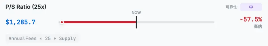 在以太坊这儿,市销率指市值与年度交易手续费收入的比值。因为手续费最终都流向了验证者所以网络不存在市盈率的说法。Token Terminal 采用了该种方式进行估值, 25 倍为成长型科技股的估值水平,Hashed 将其称之为「L1 协议估值的行业标准」。该模型的计算公式为 Annual_Fees × 25 ÷ Supply,得出的价格是 1285.7 美元,较目前价格有 57.5% 的下跌空间。