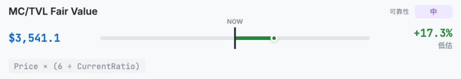 该模型本质是一种均值回归的模型,计算方式就是认定市值与 TVL 比值的历史平均水平为 6 倍,超过即为高估,不够则为低估,公式为 Price × (6 ÷ Current Ratio),得出的价格是 3541.1 美元,较目前价格有 17.3% 的上涨空间。