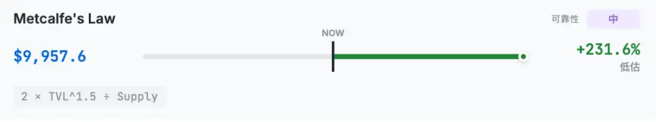 Hashed 表示,该模型已被学术研究人员(Alabi 2017, Peterson 2018)对比特币和以太坊进行了实证验证。这里使用 TVL 作为网络活动的代理指标。计算公式为 2 × (TVL/1B)^1.5 × 1B ÷ Supply,得出的价格是 9957.6 美元,较目前价格有 231.6% 的上涨空间。