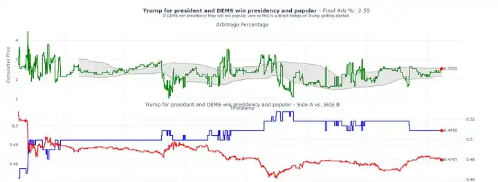 這個策略目前顯示 2.55% 的套利空間。在這一組合中,我們一方面押注川普勝選,另一方面透過下注民主黨同時贏得普選票和總統大位來進行對沖。雖然這並不是一個完全等價的對沖(因為民主黨有可能在未贏得普選票的情況下贏得總統職位),但根據我的模型,這種情況出現的機率極低。因此,我認為這一對沖結構是穩健的。